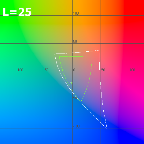 Для оценки цветового охвата использовался колориметр Spyder3 из комплекта Spyder3Studio. График цветового охвата строился для цветовой координатной системы Lab в координатах ab для светлости L=25, 50 и 75. На изображениях зелёная кривая — график цветового охвата дисплея тестируемого ноутбука, белая — стандартное цветовое пространство sRGB. Как видно на графиках, цветовой охват невелик, и даже гораздо более дешёвые модели показывали лучшие результаты.