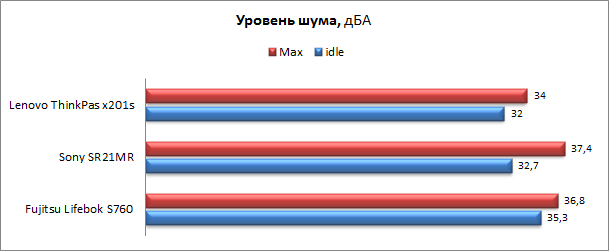 Ноутбук мощный, но в то же время достаточно тихий, и при невысоких нагрузках его почти не слышно — уровень шума составляет всего 32,0 дБА при измерении в 20 см от центра ближнего к пользователю края. При средних нагрузках уровень шума не изменяется, и только если выжимать из ноутбука все, на что он способен, более трех минут, кулер раскручивается до второй скорости, а уровень шума при этом возрастает до 33,5 дБА. Лишь изредка вентилятор разгоняется до максимума, а уровень шума достигает отметки 34,0 дБА, что сравнительно немного. Ниже приведена сводная диаграмма уровня шума в режиме простоя и в режиме максимальной нагрузки для Fujitsu Lifebook S760, Lenovo ThinkPad x201s и Sony VGN-SR21MR