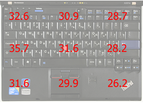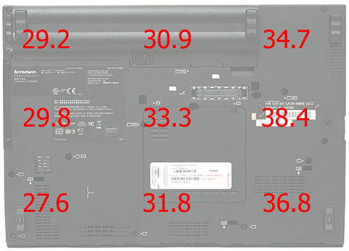 А вот с температурой корпуса не всё так гладко — в некоторых точках он существенно нагревается, хотя работе это особо не мешает. Замеры уровня нагрева корпуса осуществлялись в девяти точках днища и в девяти точках рабочей области после 2 часов простоя и 30-минутного прогона пакета 3DMark 2006, температура окружающей среды в это время составляла +21 градус Цельсия. В зависимости от точки измерения рабочая область разогревалась до 26,2-33,6 градуса, а днище до 27,6-38,4 градуса.