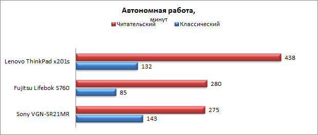 Для возможности сравнения ниже приведена диаграмма времени автономной работы в режимах «Классический» и «Читательский» для следующих мобильных ПК: