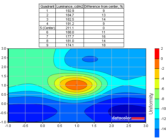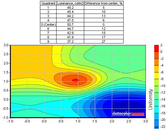 Равномерность подсветки измерялась после калибровки дисплея для двух уровней яркости: максимальной и половинной (100% и 50%). На графиках, приведённых ниже, указано отличие яркостей областей от центральной. Разница с центром указана в процентах.