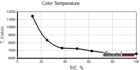 Также после калибровки была измерена зависимость цветовой температуры от уровня яркости при целевом значении 6500K.