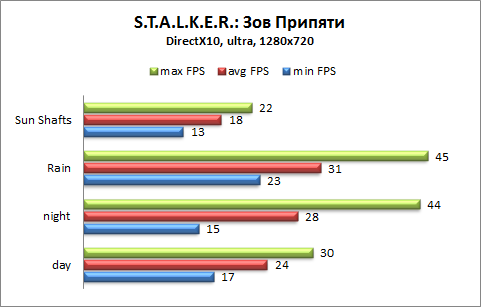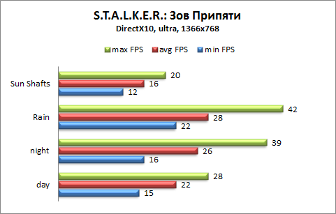 Производительность системы была измерена в играх S.T.A.L.K.E.R.: Зов Припяти и Far Cry 2 при помощи распространяемых с играми тестовых пакетов. В бенчмарке Far Cry 2 тестовая сцена «Ranch Long» запускалась пять раз, в таблицы результатов вносились усреднённые данные. Бенчмарк S.T.A.L.K.E.R.: Зов Припяти запускался единожды, но тестовая сцена прогонялась при различных погодных условиях. Запуск тестовых сцен для всех игровых бенчмарков производился при максимально допустимом разрешении 1366х768, а также, для возможности сравнения в будущем, при разрешении 1280х720 точек.