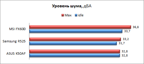 В режиме простоя ноутбук не самый тихий, и уровень шума достигает отметки 33,7 дБА, но зато на вторую скорость (она же и максимальная) кулер раскручивается крайне неохотно и только при очень длительных высоких нагрузках. Вентилятор разгоняется достаточно плавно, поэтому смена скоростей не особо привлекает внимание, да и максимальный уровень шума достаточно невелик – 36,8 дБА. В обычном офисном режиме работы или во время запуска несложных 3D-игр при температуре окружающей среды +21 градус Цельсия вторую скорость можно вовсе не зафиксировать. Но всё же есть и небольшая недоработка в алгоритме работы активной составляющей охлаждающей системы – кулер может сбросить скорость даже до прекращения максимальных нагрузок, лишь немного остудив процессор, поэтому при длительных высоких нагрузках возможна периодическая смена скоростей вращения кулера. Более правильным было бы охлаждение «с запасом», дабы после сбрасывания оборотов в скором времени не происходил возврат на максимальную скорость, ведь больше досаждает не уровень шума (тем более максимальный уровень у ноутбука невелик), а частая смена скоростей. Ниже приведена сводная диаграмма уровня шума в режиме простоя и в режиме максимальной нагрузки для ASUS K50AF, Samsung R525 и MSI FX600.