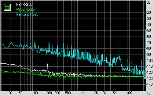 Тестирование аудиотракта производилось в пакете RightMark Audio Analyzer (далее RMAA) при помощи звукового интерфейса Creative E-MU 0202 USB. Все спецэффекты отключены, настройки эквалайзера выставлены по умолчанию. Перед началом тестирования драйверы аудиокодека были обновлены до наиболее свежей версии на момент тестирования. В качестве оппонента был взят ноутбук ASUS K50AF - его звуковой тракт основан на чипсетном решении VIA VT1708S, которое крайне редко встречается в ноутбуках, еще одним оппонентом был выбран Samsung R525, в котором используется тот же кодек, что и у героя материала. Стоит отметить, что образец Samsung R525, попавший на тестирование, показал не совсем адекватные результаты, что, возможно, было связано с браком конкретного образца.