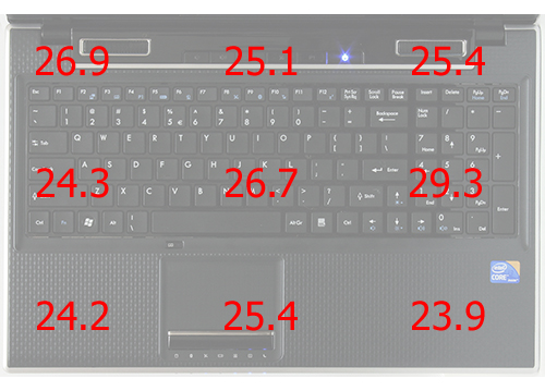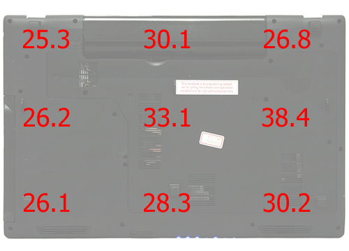 Замеры уровня нагрева корпуса осуществлялись при температуре окружающей среды +21 градус Цельсия в девяти точках днища и в девяти точках рабочей области после 30-минутного прогона пакета 3DMark 2006. Рабочая область, в зависимости от точки измерений, разогревалась до 23,9-29,3 градуса, а днище до 25,3-38,4 градуса.