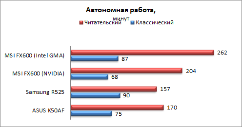 Для возможности сравнения ниже приведена диаграмма времени автономной работы в режимах «классический» и «читательский» для следующих мобильных ПК: