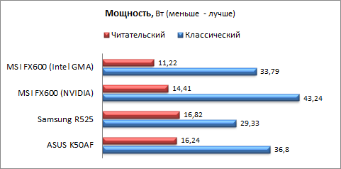 В связи с тем, что оппоненты оснащены аккумуляторами различной емкости, было решено добавить сравнительную диаграмму, демонстрирующую потребление энергии в режимах "классический" и "читательский" пакета Battery Eater Pro.