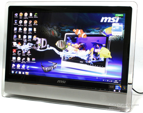 Одна из главных особенностей моноблока – возможность воспроизведения 3D-видео и запуск игр с отображением в 3D-режиме. Технологий отображения 3D-контента довольно много, и у каждой есть свои достоинства и недостатки, поэтому война форматов неизбежна, но в MSI уже поддержали технологию, требующую использования затворных очков. Данная технология не нова, а механический аналог современных очков затворного типа использовался ещё в 30-х годах прошлого века. Принцип работы в целом довольно прост – для каждого глаза поочерёдно с большой частотой отображается своя картинка. Долгое время развитие технологии сдерживало низкое время реакции ЖК-дисплеев, из-за чего при использовании очков затворного типа было бы заметно мерцание. Как уже упоминалось, в тестируемом моноблоке используется 120 Гц матрица, которой вполне достаточно для комфортной работы.