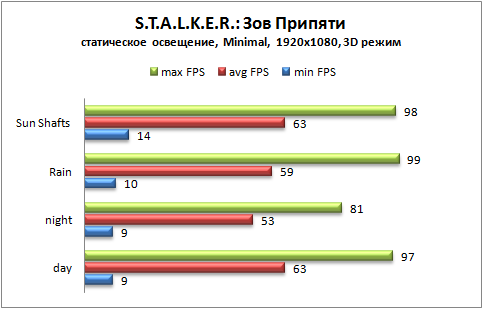 Производительность системы была измерена в играх S.T.A.L.K.E.R.: Зов Припяти и Far Cry 2 при помощи распространяемых с играми тестовых пакетов. В бенчмарке Far Cry 2 тестовая сцена запускалась 5 раз, в таблицы результатов вносились усреднённые данные 5 запусков, бенчмарк S.T.A.L.K.E.R.: Зов Припяти запускался единожды, т.к. в программе не предусмотрена возможность выбора количества циклов, но при различных погодных условиях. Запуск тестовых сцен для всех игровых бенчмарков производился при максимально допустимом разрешении 1920х1080, а также при разрешении 1280х720 точек.