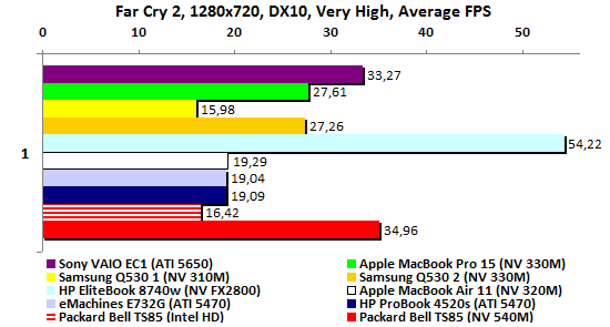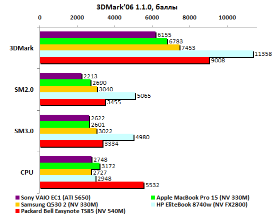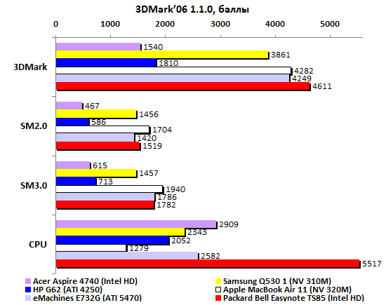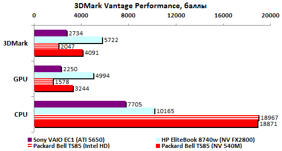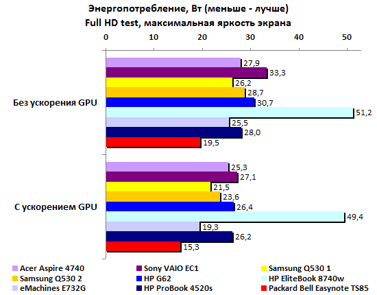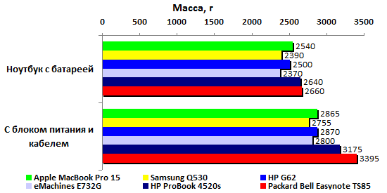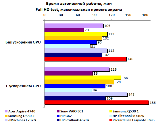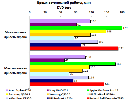 Прошлогодние четырехъядерные процессоры Intel не особенно впечатляли на фоне более высокочастотных двуядерных. С Sandy Bridge совсем другое дело: Core i7-2720QM стал первым мобильным ЦП, взявшим заветную высоту – 10000 очков в процессорном тесте PCMark’05. Крайне высоко оценивает этот пакет и производительность встроенного в процессор графического ядра.  По мнению 3DMark’06, новая интегрированная графика Intel способна на равных конкурировать как с встроенной GeForce 320M, так и с младшими дискретными адаптерами предыдущих поколений – что от ATI, что от NVIDIA. Ну а в процессорном тесте 3DMark’06 архитектура Sandy Bridge просто вне конкуренции: результат вдвое выше, чем у двуядерных ЦП Intel прошлого поколения.  Неплохо смотрится и GeForce GT 540M. До уровня действительно мощной графики ему, правда далеко (в данном случае эту планку задает Quadro FX2800). Но с прошлогодними адаптерами среднего уровня новичок справляется без особых проблем.   Примерно так же проявляет себя GeForce GT 540M и в Unigine Heaven 2.0, и в Resident Evil 5, и в Far Cry 2. Интегрированная графика Intel показывает в этих тестах чуть меньшие результаты, чем в пакетах семейства 3DMark. Но все равно смотрится очень и очень достойно: настолько слабые решения, как Mobility Radeon HD 5470 или GeForce 310M в этом году мы уже точно не увидим – в их использовании попросту не будет никакого смысла.    В S.T.A.L.K.E.R. новый адаптер GeForce GT 540M резко уходит в отрыв от конкурентов – надо полагать, сказывается помощь быстрого центрального процессора.  В целом, хорошо проявили себя все три важнейших компонента системы. И интегрированная графика Intel, и дискретный адаптер NVIDIA выступили весьма успешно. Но главный герой приведенных выше тестов – Core i7-2720QM. Он действительно гораздо мощнее, чем все мобильные процессоры прошлого года. Осталось проверить, как повышение производительности сказалось на энергопотреблении. ⇡#Тестирование – масса, время автономной работыПопавший на тест образец Packard Bell Easynote TS85 был оснащен стандартным для бюджетных моделей всех принадлежащих Acer брендов 6-элементным аккумулятором. Батарея чрезвычайно компактна, но и ёмкость её невелика: 47,5 Вт*ч. Такими же малоёмким батареями оснащались протестированные в 3DNews ноутбуки Acer Aspire 4740 и 5740, а также совсем бюджетные eMachines E730G и E732G. А вот блок питания оказался неожиданно мощным: 120 Вт, размеры и масса соответствующие. Ноутбук и сам не из легких, а в комплекте с таким громоздким блоком питания его масса серьезно превышает три килограмма. Весьма немало для современной «пятнашки», даже сравнительно мощной. Впрочем, не стоит забывать, что это ранний, предварительный образец – ближе к появлению этого ноутбука на прилавках магазинов все может сильно измениться.  Несмотря на невысокую емкость батареи, ноутбук способен достаточно долго проработать в режиме минимальной нагрузки. Похоже, в Intel немало поработали над снижением потребления новых процессоров: 5,5 часов автономности для портативного компьютера с четырехъядерным ЦП – результат доселе невиданный.  Энергопотребление в данном режиме самое низкое среди всех сравниваемых моделей – а ведь почти все они построены на базе двуядерных процессоров.  Если немного нагрузить систему воспроизведением DVD-видео, то Packard Bell TS85 смещается на второе место – вырвавшийся в лидеры MacBook Pro 15 берет емкостью аккумулятора.  Если же посмотреть на энергопотребление, то оно по-прежнему лучшее среди сра