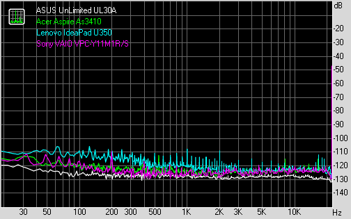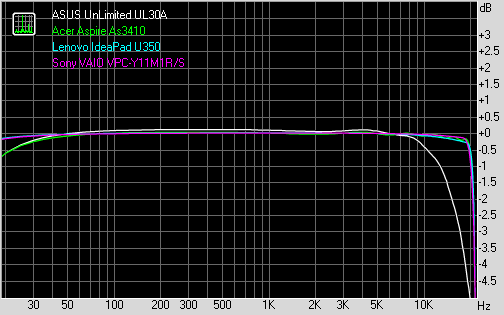 ⇡#Звуковая подсистемаКачество звучания встроенных динамиков примерно такое же как у ASUS UL30A и Lenovo U350, т.е. звук чистый, без шумов и скрипов, запас громкости приличный, с пробивающимся ВЧ-диапазоном, но басов, как водится, нет и в помине. Встроенная акустика вполне подходит для просмотра фильмов в полевых условиях, можно даже послушать музыку, но для того, чтобы получить максимум удовольствия от просмотра видео или прослушивания музыки, стоит использовать внешнюю акустическую систему либо наушники, тем более, что у героя материала, как показало тестирование, аналоговый аудиовыход весьма качественный. Модель интегрированного аудиорешения выяснить не удалось - все тестовые пакеты отображают лишь разработчика - Realtek. Тестирование аудиотракта производилось в тестовом пакете RightMark Audio Analyzer (далее RMAA) при помощи звукового интерфейса Creative E-MU 0202 USB. Все спецэффекты в настройках отключены, эквалайзер установлен в позицию по умолчанию. Драйверы были обновлены до наиболее новой версии на момент тестирования. В качестве оппонентов были взяты ультратонкие 13-дюймовые ноутбуки Acer Aspire As3410, Lenovo IdeaPad U350, ASUS UnLimited UL30. Режим работы: 16-бит, 44 кГц.