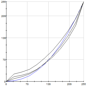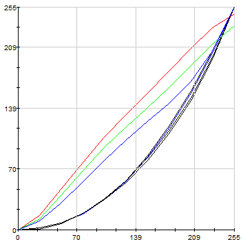 На иллюстрациях, приведенных ниже, отображены гамма-кривые (черные графики), полученные до и после калибровки дисплея, целевая гамма 2,2 (светло-синий график) и коррекция для каждого цвета (красный, синий, зеленый). ![]() SONY VAIO VPC-Y11M1R/S. Гамма-кривые. До калибровки.