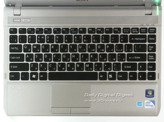 ⇡#Комплект поставкиНа тестирование был предоставлен инженерный образец, комплект поставки которого включал лишь сам ноутбук и зарядное устройство. Судя по официальному русскоязычному сайту компании-производителя, кроме разнообразных брошюр и дисков комплект поставки коммерческих версий ноутбука должен включать внешний пишущий тонкий DVD-привод устройством DVD DRXS70UW с питанием от USB-шины ноутбука. ⇡#Внешний вид и удобство использования![]() Ноутбук является первенцем в новой серии ноутбуков Sony, но не заметить сходства с серией VGN-SR невозможно. Конечно, это совершенно иной класс мобильных ПК, который толще и оборудован встроенным приводом оптических дисков, но все же полностью новой серию Y назвать нельзя. Впрочем, зачем изменения, если дизайн и так хорош - тончайшая крышка, матовое серебристое покрытие, оригинальные соединительные петли с интегрированными разъемом подключения внешнего питания и клавишей включения, красивая и удобная "чиклет"-клавиатура. ![]() Отдельно стоит отметить отсутствие глянцевых панелей, благодаря чему нотубук не коллекционирует отпечатки, да и поцарапать его сложнее. Но тут стоит сделать маленькую оговорку - ультратонкие ноутбуки Acer Aspire As3410 и ASUS UL30, к примеру, могут похвастаться металлическими крышками, тогда как у героя материала она пластиковая. Качество сборки безупречно, а при попытках скручивания и сдавливания корпус не прогибается и не скрипит, хотя от столь тонкого устройства ожидаешь совсем иного. ![]() Спереди установлено три индикатора активности, выключатель беспроводных интерфейсов и пара традиционных для ноутбуков Sony слотов установки карт памяти - отдельно для SD/MMC и MS, которая активно продвигается компанией Sony. ![]() Тыльная сторона пустует. ![]() Слева находится гнездо подключения внешнего источника питания, разъем подключения замка безопасности, вентиляционная решетка, порты D-Sub (VGA), HDMI, USB и iLink (IEEE-1394), а также пара стандартных аудиоразъемов. К последним есть одно небольшое замечание - разъем подключения микрофона выделен красным цветом, поэтому сильно бросается в глаза. ![]() Правая сторона менее загружена. Тут находится отсек установки карт расширений ExpressCard 34 мм, скрытый подпружиненной дверцей, пара портов USB, коммуникационный разъем RJ-45 и клавиша включения. ![]() Днище ноутбука изготовлено из весьма толстого пластика с сильной шероховатостью. Днище плоское, но в задней части, в районе отсека установки аккумулятора имеется небольшой выступ (около 5 мм). Вентиляционных отверстий немного, но на уровне нагрева корпуса это не отображается. Корпус поддерживают пять резиновых ножек с небольшой суммарной площадью контакта с установочной поверхностью, но, несмотря на это, ноутбук хорошо цепляется за любую столешницу. Пользователю доступен один отсек - установки модулей памяти и карт расширений. ![]() Из-за особенности конструкции соединительных петель угол раскрытия крышки традиционно ограничен величиной примерно 135 градусов. ![]() Клавиатура, как уже упоминалось, не классическая, а "чиклет" - с отдельными ячейками под каждую клавишу и прямоугольным профилем клавиш. В компании Sony уже давно отдали предпочтение данному типу клавиатуры, и не зря, ведь работать с ней значительно удобнее, количество ошибочных нажатий минимально, и это при том, что ширина литерной клавиши всего 15 мм, тогда как стандартная 