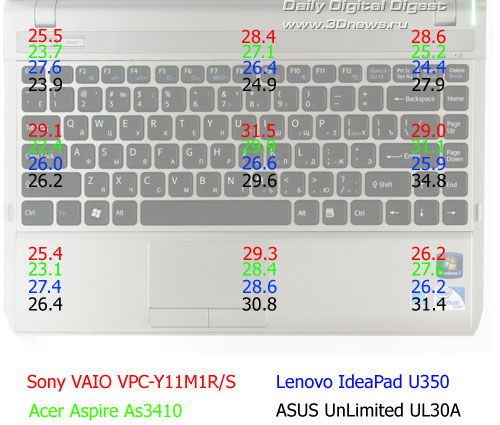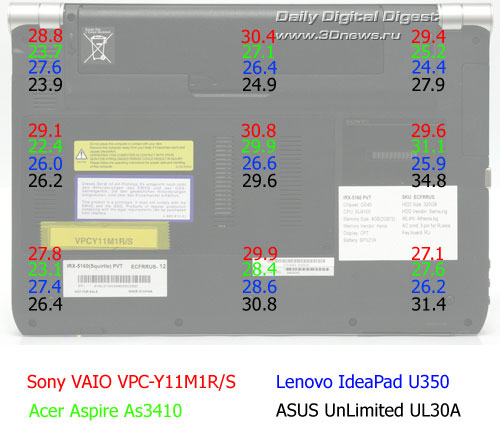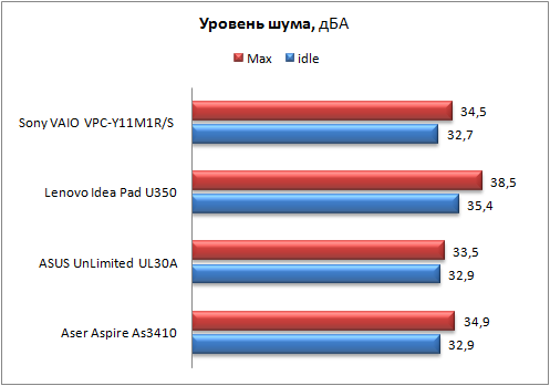 ⇡#Беспроводные интерфейсыТут ничего экстраординарного нет - стандартный набор, состоящий из модуля Bluetooth v2.1 и адаптера беспроводной сети, работающего в стандартах 802.11 a/b/g. Управления и настройка беспроводных соединений осуществляется штатными средствами ОС либо при помощи фирменной утилиты VAIO Smart Network, которая позволяет создавать множество профилей соединений и производить быстрый переход между ними. Быстрое включение/отключение беспроводных интерфейсов осуществляется при помощи двухпозиционного переключателя ползункового типа в передней части ноутбука. ⇡#Уровень шума и тепловой режимКулер охлаждающей системы ноутбука двухскоростной: в режиме простоя, а также при средней и кратковременной (до минуты) высокой нагрузке уровень шума не превышает отметку 32,7 дБА. При возникновении длительной высокой нагрузки уровень шума плавно увеличивается до 34,5 дБА. Ниже приведена сводная диаграмма уровня шума в режиме простоя и в режиме максимальной нагрузки для ноутбуков Acer Aspire As3410, Lenovo IdeaPad U350, ASUS UnLumited UL30A и Sony VAIO VPC-Y11M1R/S. Измерение уровня шума производилось на расстоянии 20 см от центра передней панели. ![]() Замеры уровня нагрева корпусов тестируемых ноутбуков осуществлялись в девяти точках днища и в девяти точках рабочей области после 30-минутного прогона пакета 3DMark 2006. Температура окружающей среды во время измерений составляла +21 градус Цельсия. Уровень нагрева корпуса оказался средним: рабочая область, в зависимости от точки измерения, прогревалась до 25,4-31,5 градуса, а днище - до 27,1-30,8. Для сравнения на изображениях, приведенных ниже, указан уровень нагрева зон не только тестируемого ноутбука, но и тех же оппонентов, что и при сравнении уровня генерируемого шума. ![]() Температурный режим. Днище.