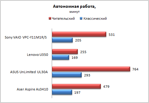 Традиционные графики тестирования накопителей пакета Lavalys EVEREST было решено заменить обычной сравнительной диаграммой, чтобы наглядно продемонстрировать разницу в производительности дисковой подсистемы всех участников тестирования. ![]() ⇡#Источник питания и автономная работаВ ноутбуке установлен базовый 6-сегментный аккумулятор средней емкости - 54 Втч. Опционально доступен более емкий аккумулятор, который, по заявлениям производителя, позволяет работать вдали от розетки в течение 15 часов, а с базовым - до 9 часов. Тестирование традиционно проводилось в пакете Battery Eater Pro в режимах "классический" и "читательский". В "классическом" режиме ноутбук продержался 205 минут, а в читательском - 531 минуту, что весьма близко к заявленному результату. Полная зарядка аккумулятора процесс довольно длительный - 225 минут. Для сравнения ниже приведена диаграмма времени автономной работы в режимах "классический" и "читательский" для следующих мобильных ПК: