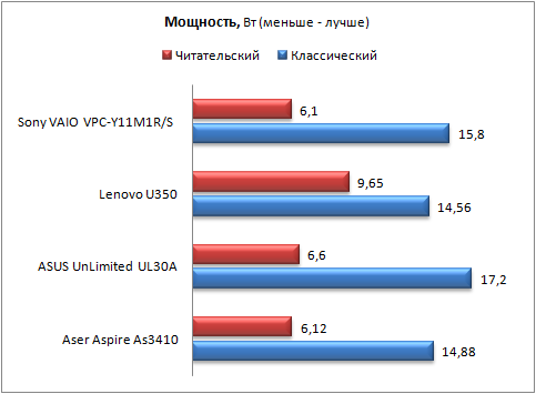 ![]() В связи с тем, что оппоненты оснащены аккумуляторами различной емкости, было решено добавить сравнительную диаграмму, демонстрирующую потребление энергии в режимах "классический" и "читательский" пакета Battery Eater Pro. ![]() ⇡#ВыводыПервое впечатление об устройстве в первую очередь формируется дизайном корпуса, эргономичностью и удобством управления. И тут с ноутбуком Sony трудно конкурировать, ведь он просто красив, тонок и удобен без каких-либо оговорок. Дисплей и встроенная акустика у тестируемого ноутбука не выдающиеся и по качеству соизмеримы с лучшими представителями сегмента, зато качество звука на аналоговом выходе чуть лучше, чем у самого сильного конкурента - ASUS UnLimited UL30A. По уровню производительности впереди модель Sony, но не стоит забывать о том, что его стоимость довольно высока, поэтому небольшой отрыв от конкурентов нельзя считать сильным преимуществом. В плане уровня шума и нагрева ноутбук опять же не лучше и не хуже конкурентов. При тестировании длительности автономной работы ноутбук поставил рекорд в энергопотреблении в режиме "читательский". В целом, ноутбук оставляет хорошие впечатления, особенно благодаря качеству сборки и удобству работы. Кроме того, как ни крути, а ноутбуки Sony - имиджевые решения, которые подчеркивают статус владельца, но цена все же отрезвляет и заставляет взвешивать все за и против. Благодарим украинское представительство компании Sony за предоставленное для тестирования оборудование.