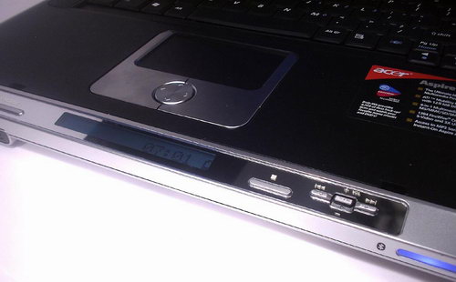 Крышка ноута сделана таким образом, что юзеру становятся видны не только три светодиодных индикатора с микрофоном под серебристо-зеркальной поверхностью, но и ЖК экран мультимедийного плеера вместе с клавишами управления.
