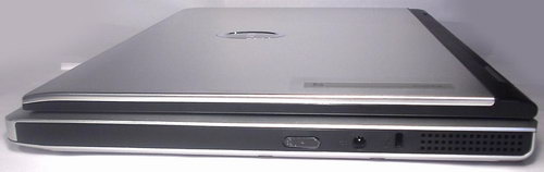 Левый борт несет разъем для подключения замка безопасности Kensington, сдвижную кнопку Power, единственные вентиляционные отверстия для выдува горячего воздуха из машины и DVD+ReWritable привод.