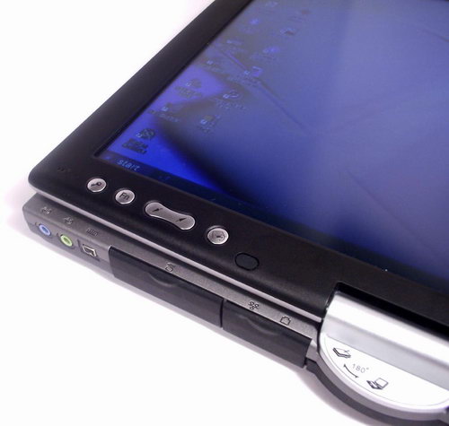 На переднюю панель помимо кнопки открытия/закрытия крышки ноута вынесена пара динамиков. Вполне логичное решение, ведь если бы они находились под крышкой, то в режиме Tablet PC были бы непременно ею и накрыты.