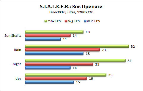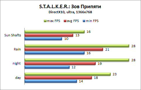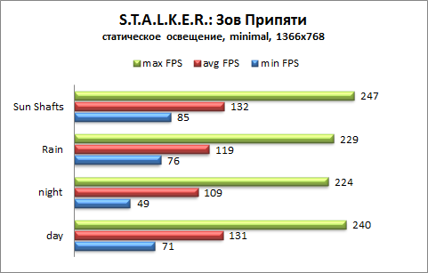 Производительность системы также была измерена в играх S.T.A.L.K.E.R.: Зов Припяти и Far Cry 2 при помощи распространяемых с играми тестовых пакетов. В бенчмарке Far Cry 2 тестовая сцена «Ranch Long» запускалась пять раз, в таблицы результатов вносились усреднённые данные пяти запусков, бенчмарк S.T.A.L.K.E.R.: Зов Припяти запускался единожды, но тестовая сцена прогонялась при различных погодных условиях. Запуск тестовых сцен для всех игровых бенчмарков производился при максимально допустимом разрешении 1366х768, а также, для возможности сравнения, при разрешении 1280х720 точек, отдельно производилось тестирование с базовыми настройками при «родном» разрешении.