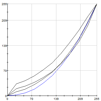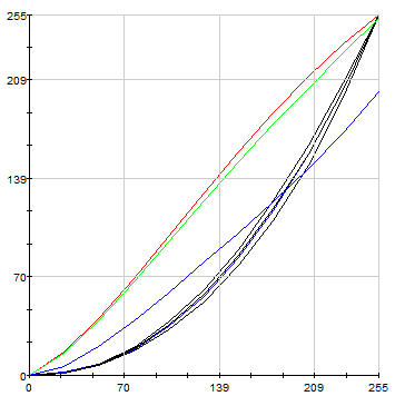 На иллюстрации, приведённой ниже, отображены гамма-кривые (чёрные графики), полученные до и после калибровки дисплея, целевая гамма 2,2 (светло-синий график) и коррекция для каждого цвета (красный, синий, зелёный).