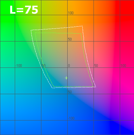 Для оценки цветового охвата использовался колориметр Spyder3 из комплекта Spyder3Studio. График цветового охвата строился для цветовой координатной системы Lab в координатах ab для светлости L=25, 50 и 75. На изображениях зелёная кривая — график цветового охвата дисплея тестируемого ноутбука, белая — стандартное цветовое пространство sRGB.