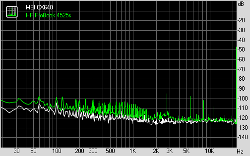 Звуковая подсистема ноутбука основана на интегрируемом решении Conexant Cx20585. Использование продукции сей фирмы совсем нетипично для MSI, которая зачастую отдаёт предпочтение разработкам Realtek. Впрочем, кодеки Conexant в ноутбуках HP и Dell иногда показывали весьма неплохие результаты, поэтому ожидалось, что в ноутбуке MSI этот чипсетный звук окажется не хуже, что и подтвердилось на практике. Тестирование аудиотракта производилось в пакете RightMark Audio Analyzer (далее RMAA) при помощи звукового интерфейса Creative E-MU 0202 USB. Все спецэффекты отключены, настройки эквалайзера выставлены по умолчанию. Перед началом тестирования драйвер аудиокодека был обновлен до наиболее свежей версии на момент тестирования. В качестве оппонента был взят ноутбук HP ProBook 4525s.