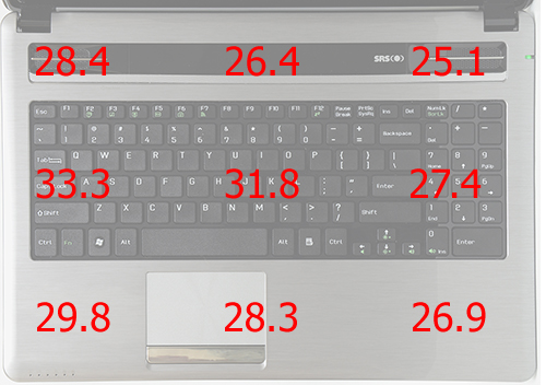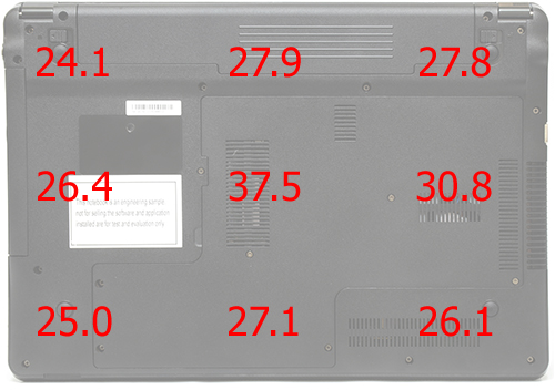 Замеры уровня нагрева корпуса осуществлялись в девяти точках днища и в девяти точках рабочей области после 30-минутного прогона пакета 3DMark 2006, температура окружающей среды и установочной поверхности во время измерений составляла +21 °C. В целом ноутбук довольно холодный, но некоторые небольшие зоны, в частности в районе отсека модулей памяти, слишком тёплые. Панели рабочей области в зависимости от зоны измерения прогревались до 25,1-33,3 °C, а днище до 24,1-37,5 °C.