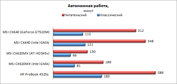 В ноутбуке установлен довольно мощный аккумулятор, ёмкость которого составляет 75 Вт*ч, что соизмеримо с ёмкостью аккумуляторов мощных геймерских ноутбуков. Конечно, целый рабочий день MSI CX640 не продержится, ведь мощность его достаточно велика, но и аккумулятор не мал. Тестирование традиционно проводилось в пакете Battery Eater Pro в режимах «Классический» и «Читательский», причём отдельно при использовании интегрированного и дискретного видео. При использовании интегрированного адаптера ноутбук продержался без малого 6 часов, точнее 348 минут в режиме «Читательский», а в режиме «Классический» — 121 минуту. При использовании видеоадаптера NVIDIA GeForce GT 520M ноутбук проработал не намного меньше — 312 и 110 минут соответственно. В новинку добавили функцию быстрой зарядки батареи, теперь по умолчанию до 80% она заряжается в полтора раза быстрее, чем раньше. На практике для зарядки до 100% потребовалось 146 минут, а до 80% — 85 минут.