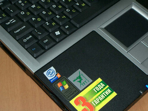 Ну, уже не терпится открыть. Внутренняя часть компьютера черная с серебристой окантовкой. Клавиатура с 87-клавишами, выполняющими функции обычной 101-клавишной клавиатуры с клавишами Windows. Под клавиатурой в центральной части расположена сенсорная панель с клавишами, заменяющими две основные кнопки мыши и колесико скроллинга. По бокам под клавиатурой много свободного места, что дает возможность работать, не напрягая рук. Там же наклеены многочисленные логотипы и лейблы. Функциональности это не добавляет, зато сразу чувствуется, что продукт ты держишь в руках солидный.