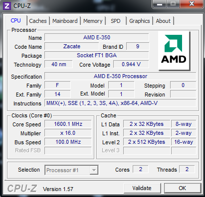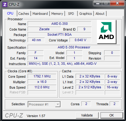 Попавший к нам вариант Fusion основан на двухъядерном процессоре с обозначением AMD E-350 и кодовым именем Zacate, функционирующем на частоте 1,6 ГГц и выполненном по 40-нм техпроцессу. Новинка построена на основе несколько упрощённой микроархитектуры К10, в которой отсутствует кеш-память третьего уровня. Кеш-память второго уровня разделена между ядрами, её размер составляет 2х512 Кбайт.