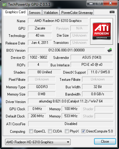 Видеоядро, которое сама AMD заодно с программой GPU-Z именует AMD Radeon HD 6310, выполнено в рамках одного чипа с процессорными ядрами по тому же 40-нм техпроцессу.