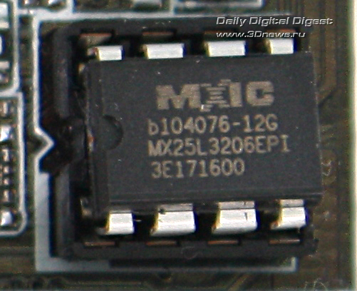 BIOS выполнен в микросхеме MxIC, подключённой к материнской плате с использованием отдельной восьмиконтактной «кроватки».