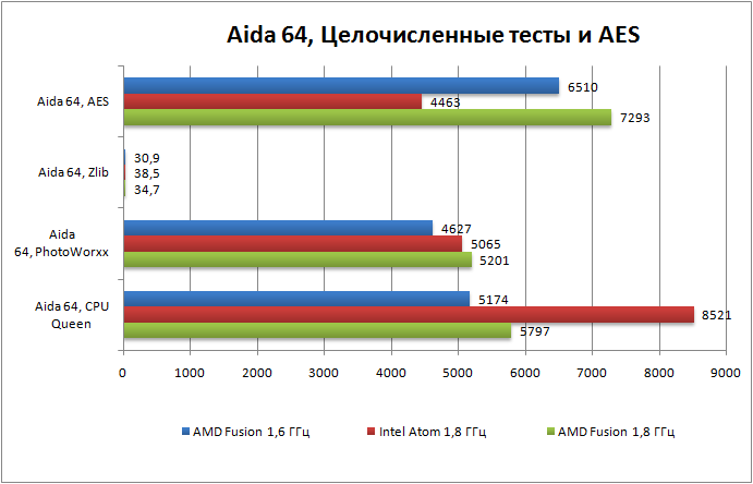 Обратная ситуация с тестом AES. Даже без разгона процессор AMD E-350 оказывается далеко впереди.