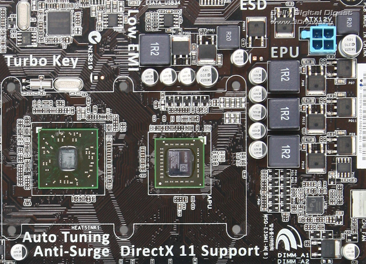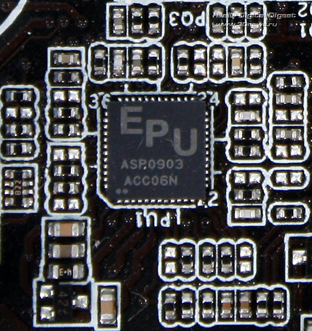 Стабилизация питания на материнской плате E35M1-M PRO реализована по схеме 4+1 фазы и управляется посредством ШИМ-контроллера EPU ASP0903.