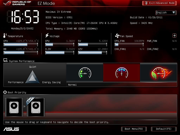Плата Maximus IV Extreme, относясь к серии Republic Of Gamers, обладает оболочкой EFI, выполненной в бордовых тонах, что соответствует общей стилистике продуктов данной серии.