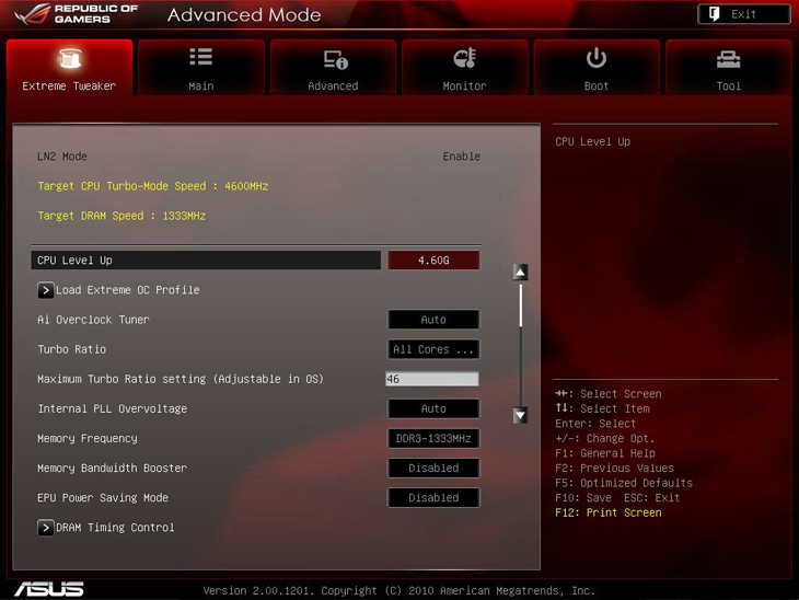 Для начала проверим работу функции автоматического разгона CPU Level UP. Для этого в соответствующем пункте раздела Extreme Tweaker BIOS (в режиме оболочки Advanced Mode) выбираем максимальное доступное значение частоты — 4,6 ГГц.