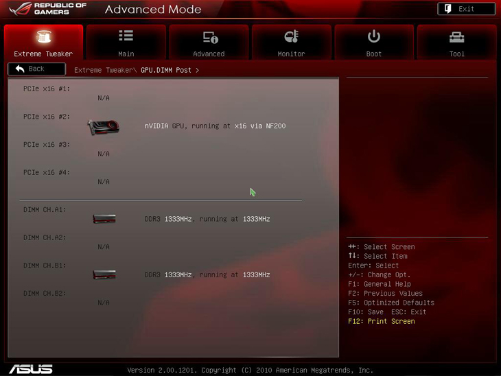 GPU.DIMM POST графически отображает наличие в слотах PCI-e x16 видеокарт и информацию о количестве и источнике задействованных линий PCI-e. Также этот подраздел даёт информацию об установленных модулях оперативной памяти для каждого слота.