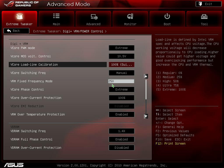 Подраздел DIGI+ VRM Power Control служит для управления системой питания процессора и оперативной памяти. Он позволяет задавать частоту ШИМ-регулятора, степень калибровочной нагрузки для управления напряжением на процессоре в различных режимах использования, количество активных фаз питания, а также устанавливать защиту от избыточного тока для основных узлов системы.
