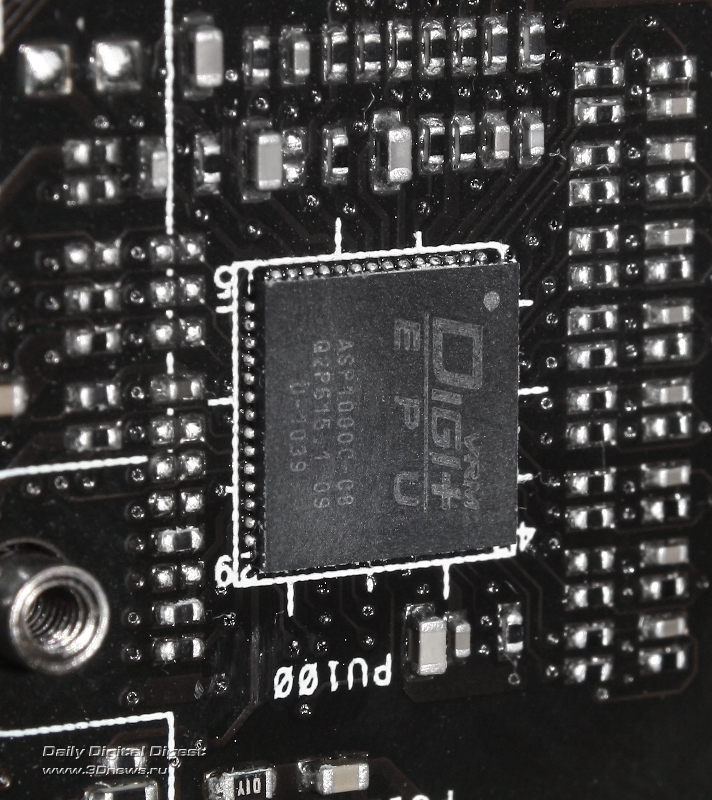 За надёжность и эффективность питания процессора отвечает перемаркированный компанией ASUS контроллер DIGI+ EPU ASP1000C (CHiL CHL8318), который является одной из составляющей технологии ASUS Dual Intelligent Processors. Он обеспечивает восьмифазную аналогово-цифровую стабилизацию напряжения питания CPU и позволяет управлять некоторыми параметрами работы системы питания, в том числе и частотой широтно-импульсной модуляции и количеством активных фаз питания. Все необходимые настройки присутствуют в соответствующем меню BIOS.