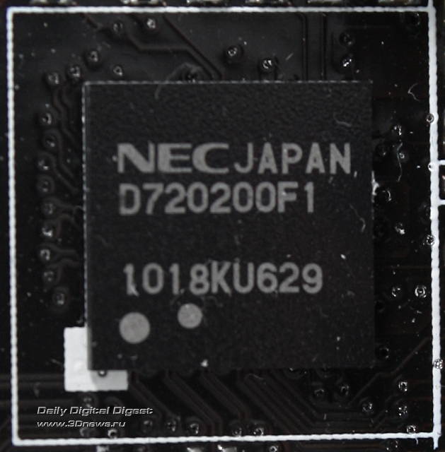 За поддержку портов USB 3.0 на задней панели отвечает хорошо известный контроллер NEC D720200F1, расположенный в непосредственной близости к портам. Однако, как известно, один контроллер от NEC может обеспечить всего лишь два порта USB 3.0, а на задней панели их восемь!