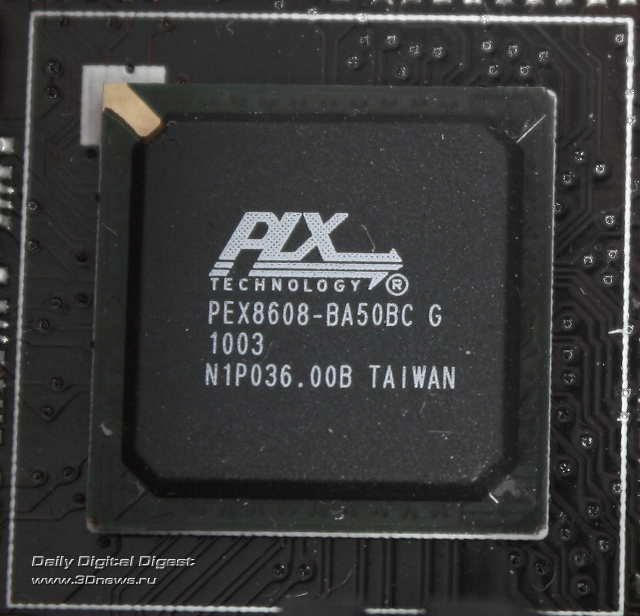 Из сторонних контроллеров, предоставляющих дополнительные линии PCI-e, на плате присутствуют NVIDIA NF200 и PLX8608. Первый из них предоставляет 32 линии PCI-e (подведённые ко второму и четвёртому слотам PCI-e x16) для реализации тандема из трёх видеокарт в режиме 3-Way SLI с использованием слотов PCI-e x16 — он скрывается под радиатором системы охлаждения неподалеку от процессора. Второй же чип предоставляет дополнительные восемь линий PCI-e, отдельного охлаждения он не требует и расположен вблизи слота PCI-e x4.