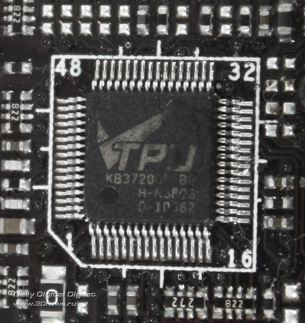 Второй составляющей «двухпроцессорной интеллектуальной технологии» является микросхема с маркировкой TPU KB37200, отвечающая за возможность автоматического разгона с помощью программы ASUS TurboV EVO.