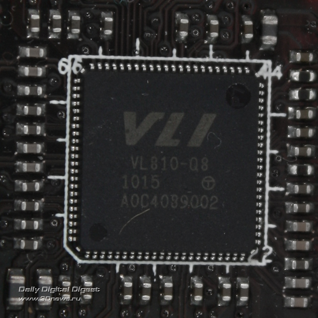 Весь секрет кроется в наличии двух встроенных USB 3.0 концентраторов, основанных на контроллерах компании VIA, имеющих маркировки VLI VL810. Конечно, данный факт означает, что полной скорости USB 3.0 невозможно будет добиться одновременно на нескольких портах, однако запас по пропускной способности (4,8 Гбит/с) достаточно велик, и большая часть существующих на данный момент устройств не способны использовать USB 3.0 «по полной».