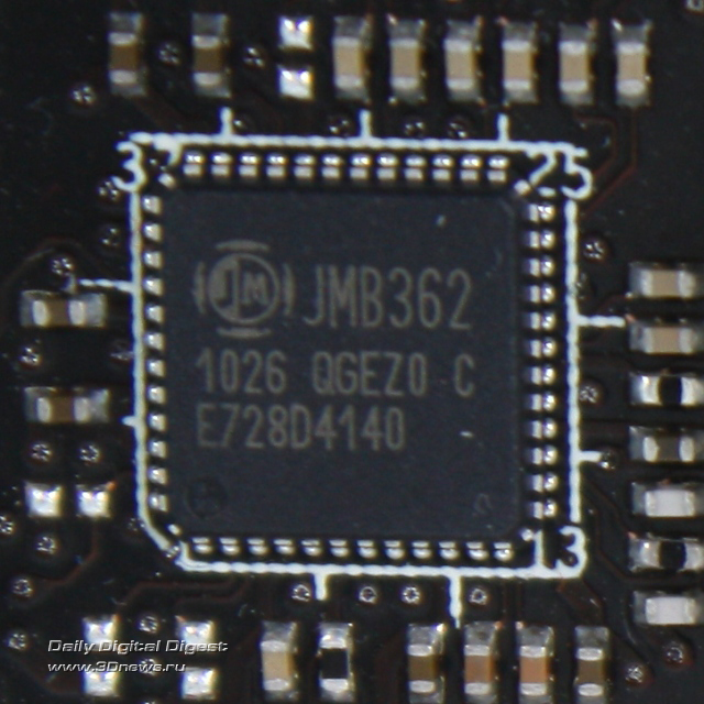 Два порта eSATA (3 Гбит/с), расположенные на задней панели, реализованы с помощью контроллера JMicron JMB362.