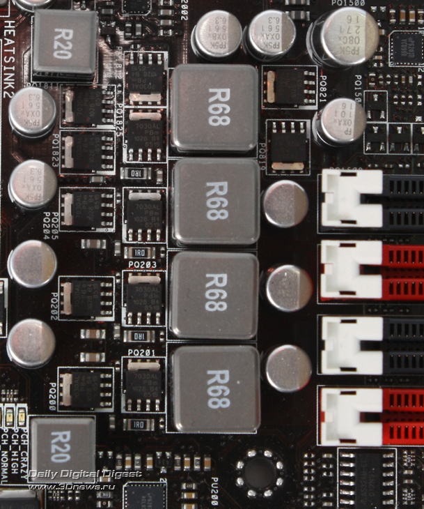 Чуть ниже, возле 24-контактного ATX-разъёма питания, расположилась «панель управления и мониторинга», предназначенная, в первую очередь, для энтузиастов. Здесь находятся четыре тумблера, позволяющие отключать слоты PCI-e x16, кнопка «Go Button», которая служит для быстрого изменения настроек системы, точки для замера напряжений в основных, самых важных узлах системы. Также присутствует индикатор POST-кодов, традиционные кнопки старта и перезагрузки системы и переключатель «LN2 Mode», позволяющий обойти так называемый «Cold Bug», который проявляется при работе с жидким азотом. Многим, однако, кажется неудобным расположение кнопок старта и перезагрузки вблизи разъёма питания ATX — зачастую этот участок платы труднодоступен.