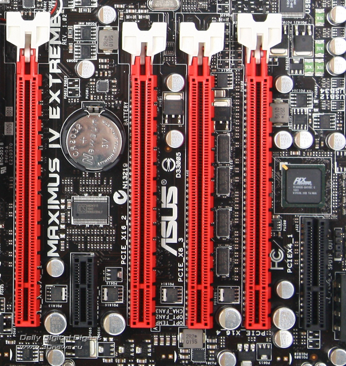 Первое, что бросается в глаза, это количество слотов PCI-e x16. Их четыре, и все они стандарта PCI-e 2.0, причём на три из них (первый, второй и четвёртый сверху) разведено по 16 линий, а на третий — 8. Поскольку системный агент процессора способен предоставить всего лишь 16 линий PCI-e, а PCH P67 — восемь, недостающие линии реализуются посредством сторонних контроллеров. Также присутствует один слот PCI-e x1 и один слот PCI-e x4. У последнего нет паза с торца, что позволяет устанавливать в него полноразмерные PCI-e x16 видеокарты.