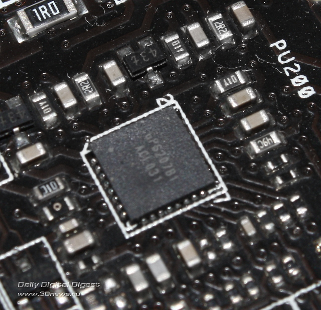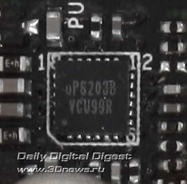Контроллер питания uP6207 способен управлять как двумя, так и тремя фазами питания, в данном случае он заведует трехфазным преобразователем напряжения оперативной памяти. Питание мостов PLX, NF200, а также PCH и PCH PLL — однофазное.