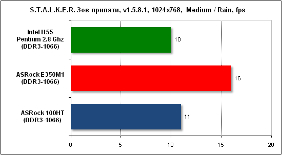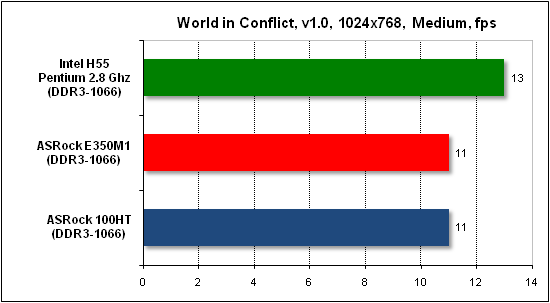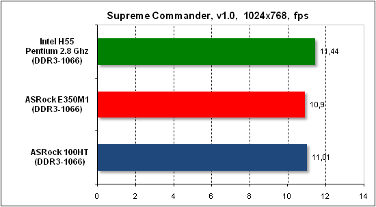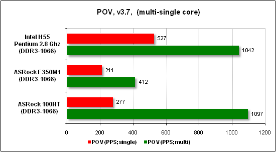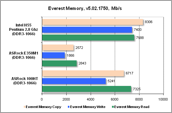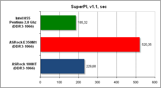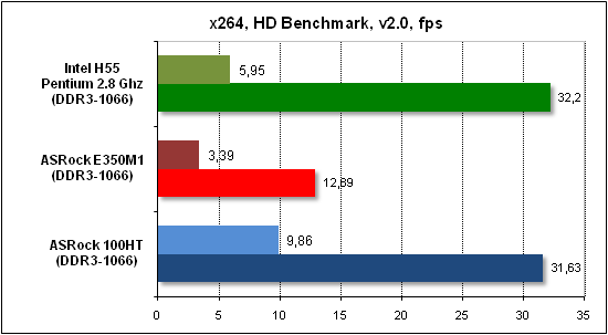 Прирост производительности новых чипов AMD позволил нам сравнить их скорость не с экономичными Intel Atom, а с более производительными системами. В частности, мы воспользовались результатами неттопа ASRock Core 100HT с мобильным процессором Core i3-330M (2,133 ГГц) и процессора Intel Pentium G6950 на ядре Clarkdale (2,8 ГГц, LGA1156). Кроме этого, мы заменили операционную систему Windows XP, которая является наилучшим решением для маломощных экономичных систем, на более ресурсоемкую Windows 7.